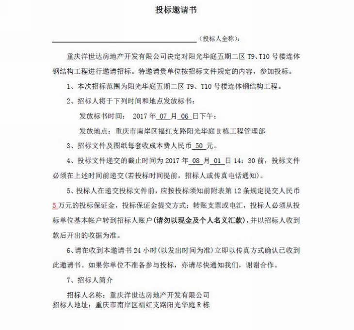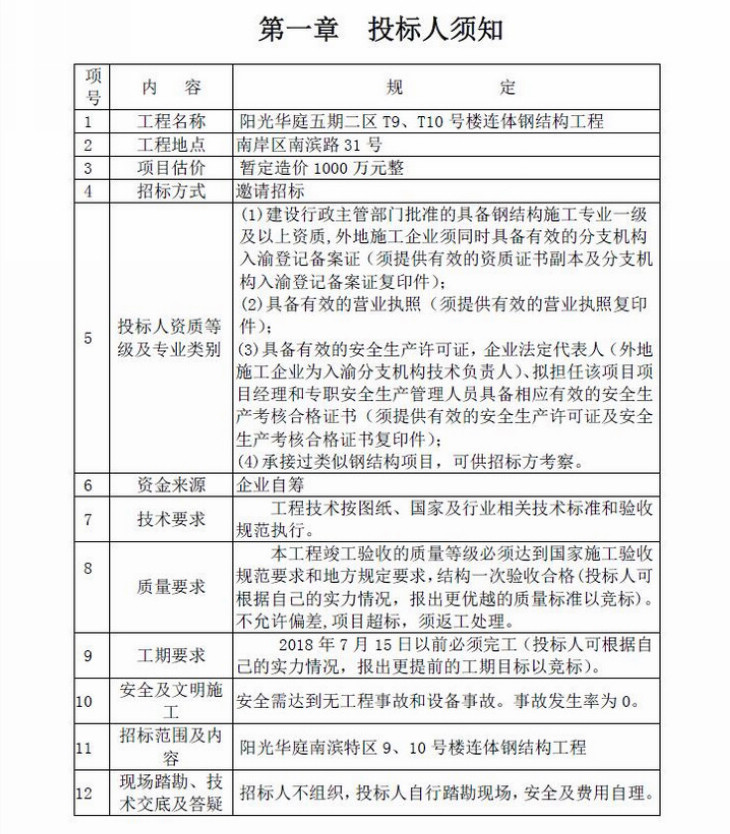 陽光華庭五期二區T9、T10號樓連體鋼結構工程招標文件