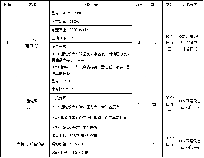 本項(xiàng)目適用于重慶帝力游艇制造有限公司:南部縣地方海事處33米應(yīng)急救援艇機(jī)電設(shè)備采購機(jī)械設(shè)備采購部分,該項(xiàng)已具備招標(biāo)條件,先對(duì)該項(xiàng)目進(jìn)行單一來源采購招標(biāo)。