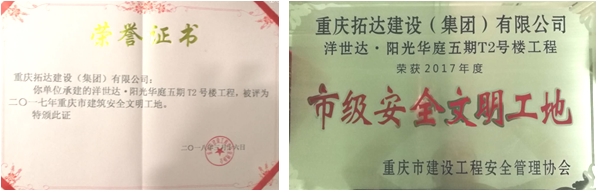 2018年3月16日,經(jīng)重慶市建設(shè)工程安全管理協(xié)會嚴格甄選,洋世達·南濱特區(qū)(陽光華庭五期)二區(qū)T2號樓項目榮獲“2017年度市級安全文明工地”的稱號。
