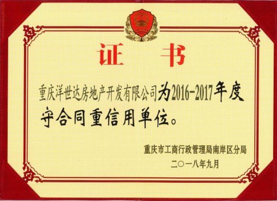 2018年12月4日下午2點30分,重慶市工商行政管理局南岸區(qū)分局在分局二樓會議室隆重召開了南岸區(qū)“守合同 重信用”企業(yè)座談會。分局黨組書記、局長齊琦、分管局長鄔繼貧、相關(guān)科室負責人及南岸區(qū)企業(yè)代表約150人出席了本次會議。重慶洋世達房地產(chǎn)開發(fā)有限公司榮獲南岸區(qū)2016-2017年度守合同重信用單位稱號。