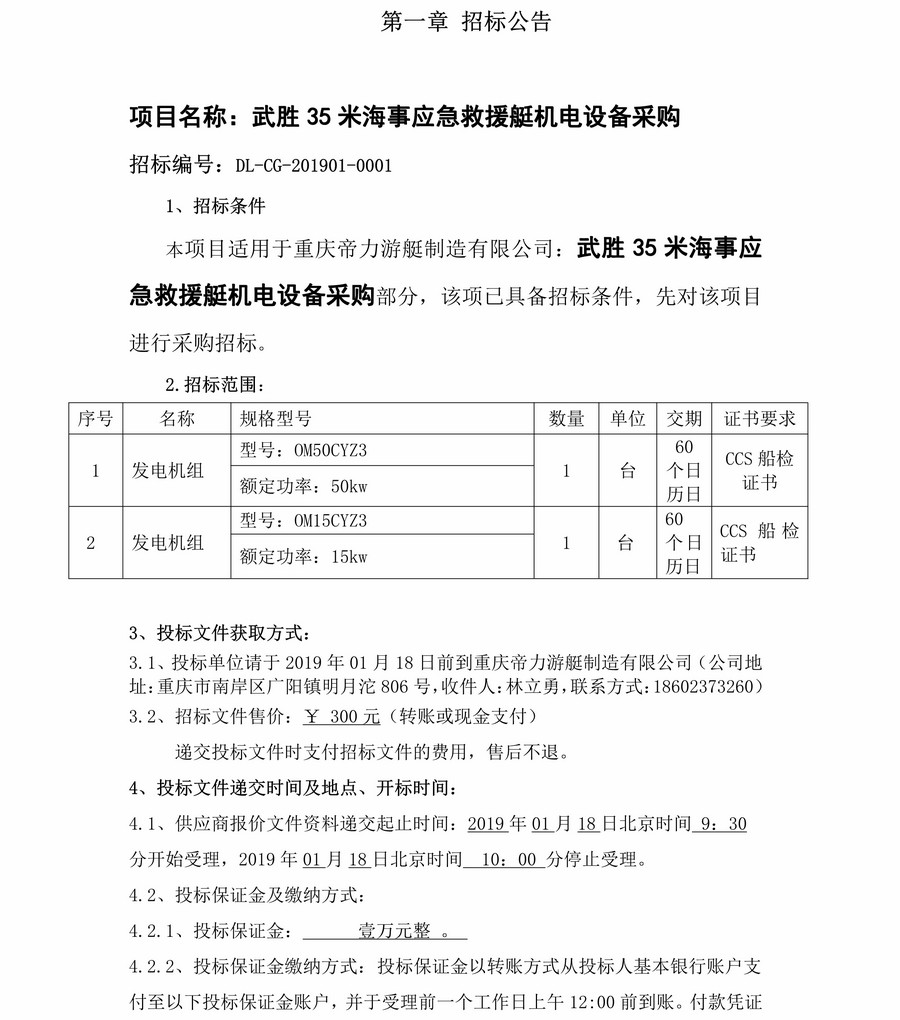 武勝35米海事應急救援艇機電設備采購