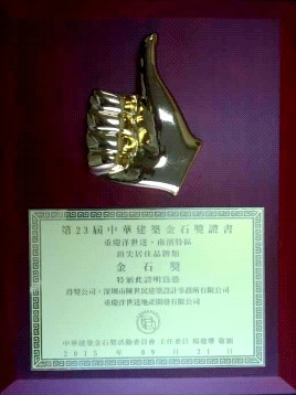 9月21日晚7點(diǎn),羅明德總工程師參加了由中華建筑金石獎(jiǎng)活動(dòng)委員會(huì)在臺(tái)灣舉辦的第23屆中華建筑金石獎(jiǎng)?lì)C獎(jiǎng)典禮。重慶“洋世達(dá)•南濱特區(qū)”項(xiàng)目,榮獲了“頂尖居住品牌類金石獎(jiǎng)”。